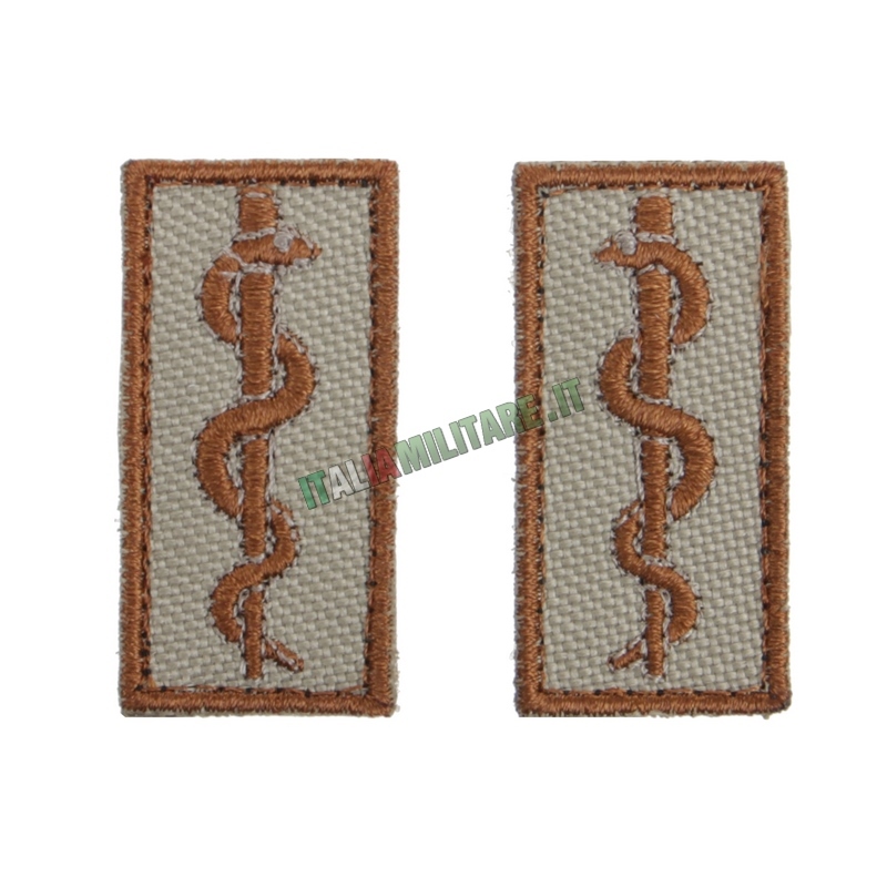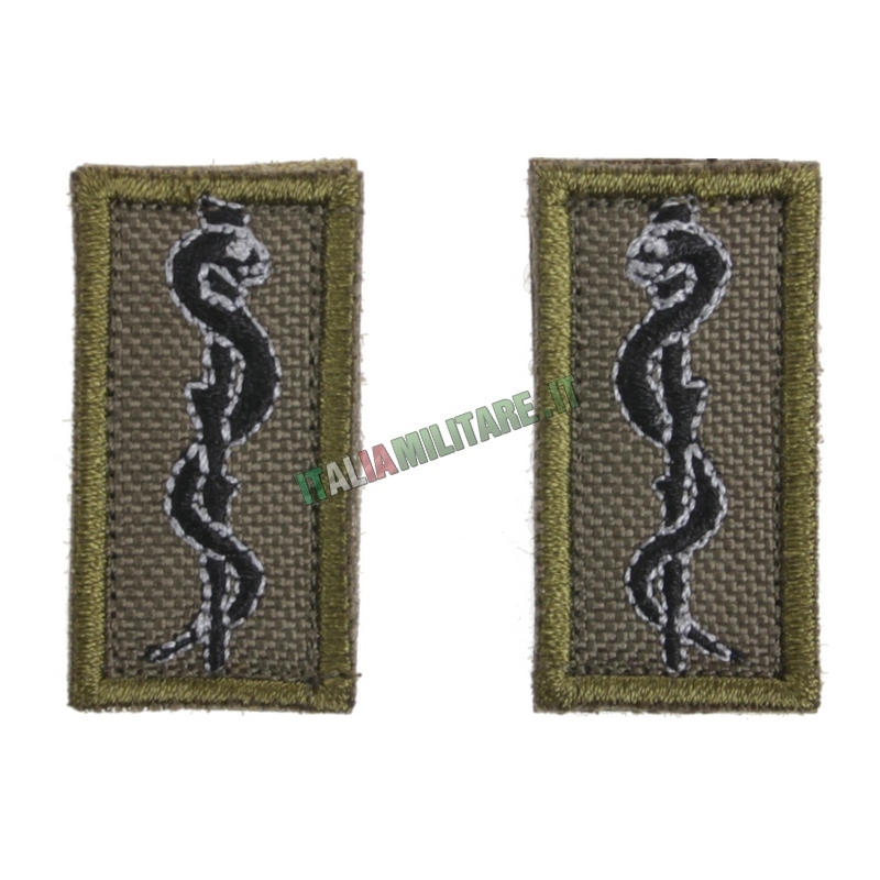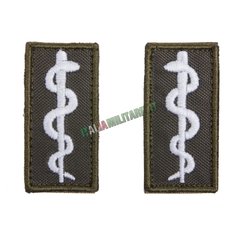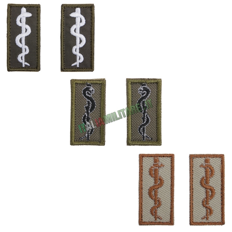 COPPIA ALAMARI SANITA' - MEDICOModello di mostrine ricamate per corpo militare sanitario - medico realizzate su tessuto, prodotte in Italia, dotati di scratch sul retro e adatti per essere usati con l'uniforme, la mimetica vegetata, la polo in vestizione estiva, ecc. IMPORTANTE: questo articolo è un prodotto ufficiale autorizzato da parte di Difesa Servizi, viene venduto con cartellino che ne indica il codice di contratto autorizzativo alla produzione.
