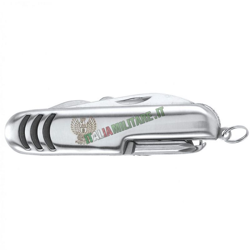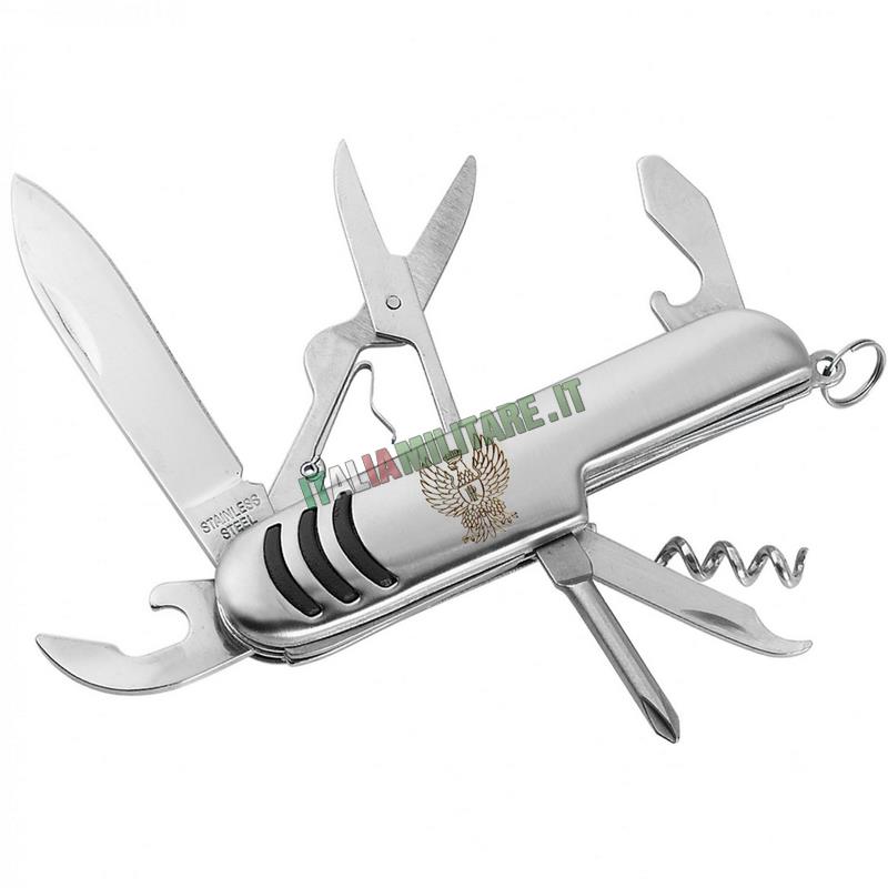 COLTELLO MULTIUSO PSColtellino richiudibile multiuso dotato di 7 funzioni, con logo dell'Aquila della Polizia di Stato. Ha tre inserti antiscivolo per lato per assicurare una presa salda e un piccolo cerchio portachiavi sul fondo. FUNZIONI: