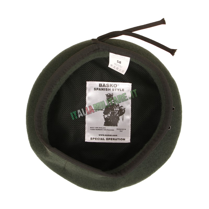 BASCO SPAGNOLO MARÒ SAN MARCOIl basco militare è realizzato in Italia con lana di qualità superiore, è dotato di una fascia in tessuto sintetico che rifinisce il cappello e poggia sulla circonferenza della testa. Dispone di un cordoncino che consente a chi lo indossa di stringere il cappello sulla testa: i cordoncini vengono tagliati a misura o, più tradizionalmente, lasciati penzolare sul retro del basco stesso. Il cappello è spesso decorato con un distintivo in stoffa o in metallo e per questo dispone di un rinforzo interno nella posizione in cui viene applicato il fregio, in modo da fornire supporto e struttura quando è indossato. USO DEL BASCO IN VENDITA: