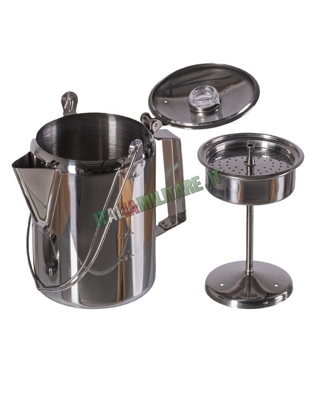 BOLLITORE CAFFETTIERA IN ACCIAIO CON FILTRO MIL-TECBollitore multiuso in acciaio Inox dotato di speciale filtro per caffè, ideale per l'utilizzo in esterno, camping e giardino. Con l'utilizzo del filtro per caffè fornito e scaldando il recipiente direttamente sul fuoco o su fornello a gas, si ottiene il caffè in soli 7-10 minuti. Senza il filtro è utilizzabile anche come un comune bollitore. Il bollitore in acciaio inossidabile Mil-Tec è munito di manico laterale per una facile impugnatura e di un ulteriore manico lungo per essere appeso sopra la fiamma. Inoltre, il coperchio è costituito da una chiusura di sicurezza con cerniera e sormontato da un pomello in vetro per garantire una facile apertura.