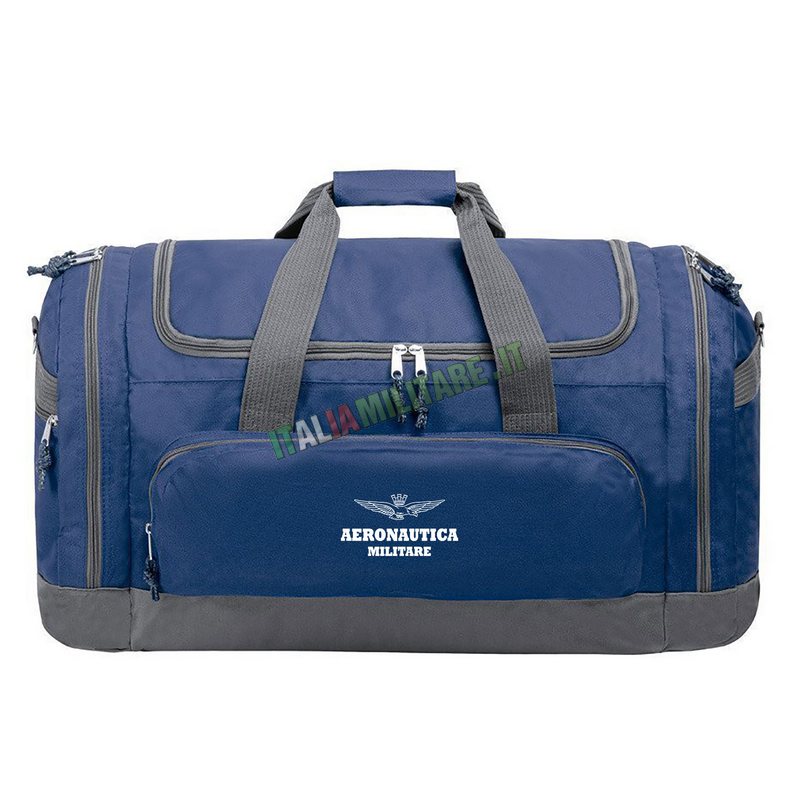 BORSONE AERONAUTICA MILITAREBorsa sportiva dell'Aeronautica Militare in colore blu con finiture grigie, con scritta e stemma sul fronte. Il borsone è molto ampio, privo di scomparti interni per accogliere anche gli oggetti più ingombranti, e dispone sia di maniglie che di tracolla per facilitare il trasporto. CARATTERISTICHE: