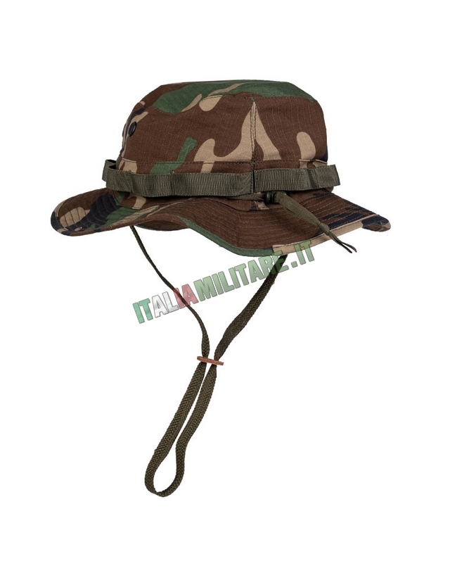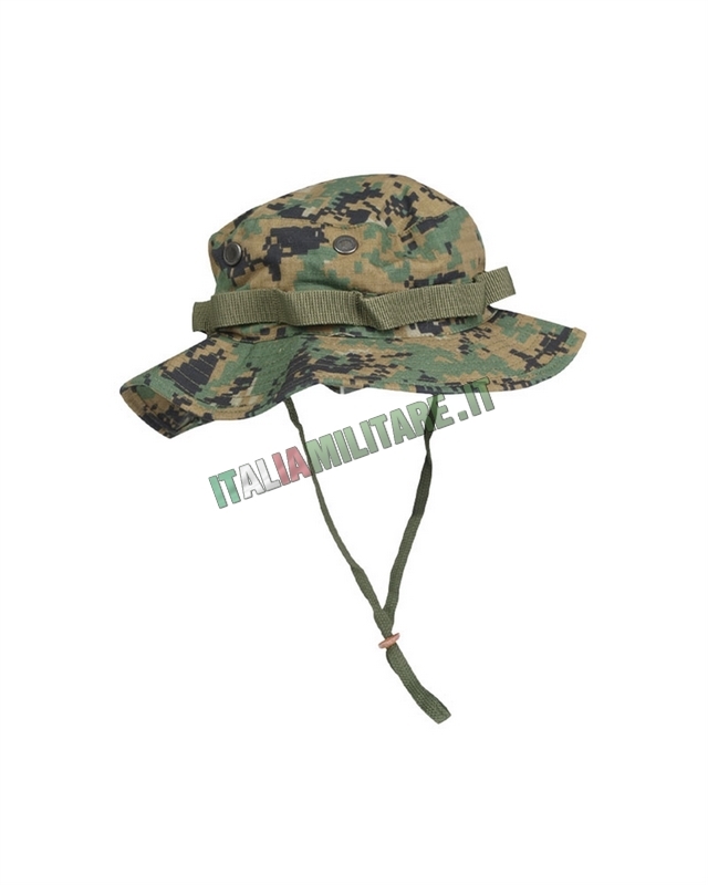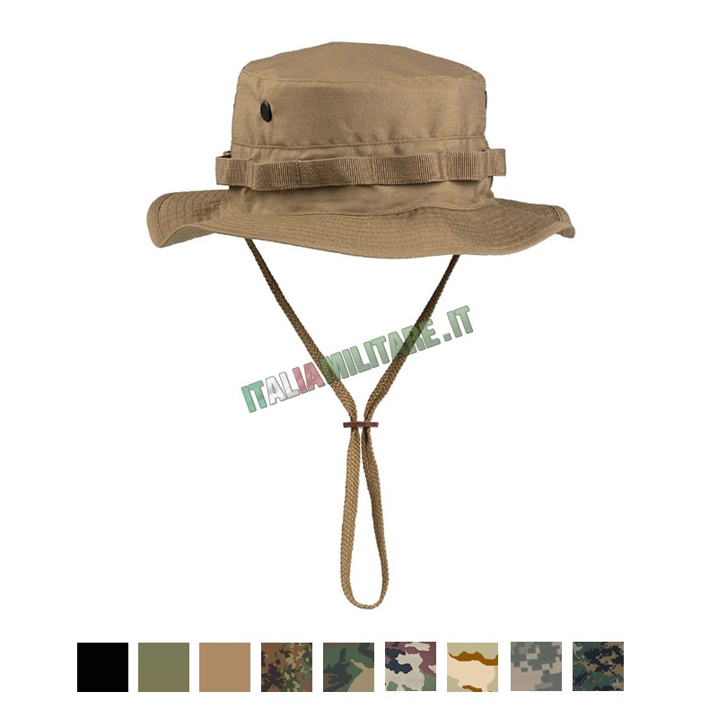 CAPPELLO MILITARE JUNGLE MILTECModello di cappello militare in cotone ripstop comunemente definito come "jungle" per la sua forma: è un copri capo militare impiegato dalle forze armate di tutto il mondo in combinazione con la vestizione da combattimento. Il cappello jungle ha il pregio di fornire protezione alla testa e al volto ma funge anche da primo elemento di camuffamento e mimetizzazione contribuendo in ρiυ' a ridurre l'impatto visivo del volto stroncandone i lineamenti quando ben calato. Sulle fettucce inoltre, presenti sull'intera circonferenza del berretto, è possibile inserirvi piccoli accessori di pronto uso ma soprattutto anche elementi di mimetismo come ad esempio arbusti, fogliame, strisce di juta e tessuto, ecc.