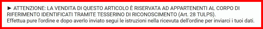 Alcuni prodotti su questo sito non sono di libera vendita e sono disciplinati dal TULPS (Testo Unico delle Leggi di Pubblica Sicurezza). Questo è segnalato da un avviso all'interno della descrizione di ogni specifico prodotto, come il seguente: