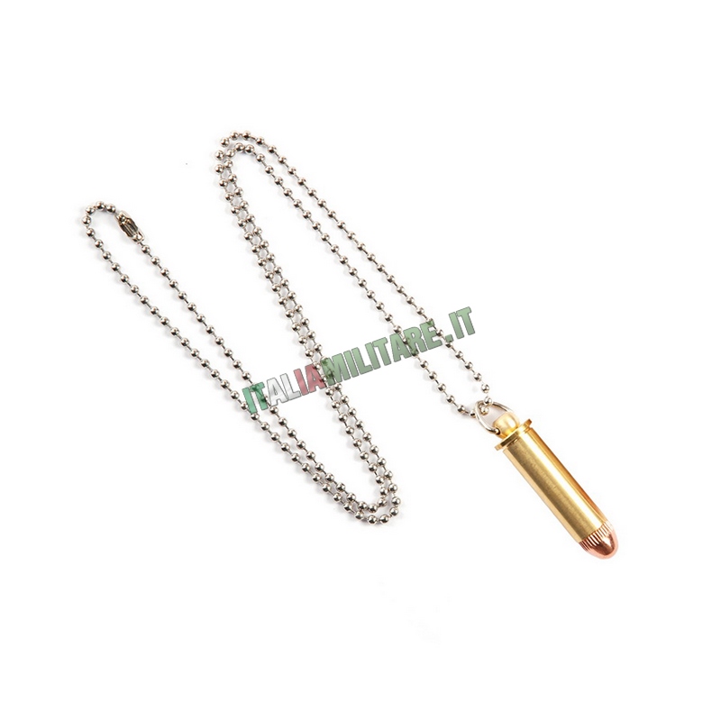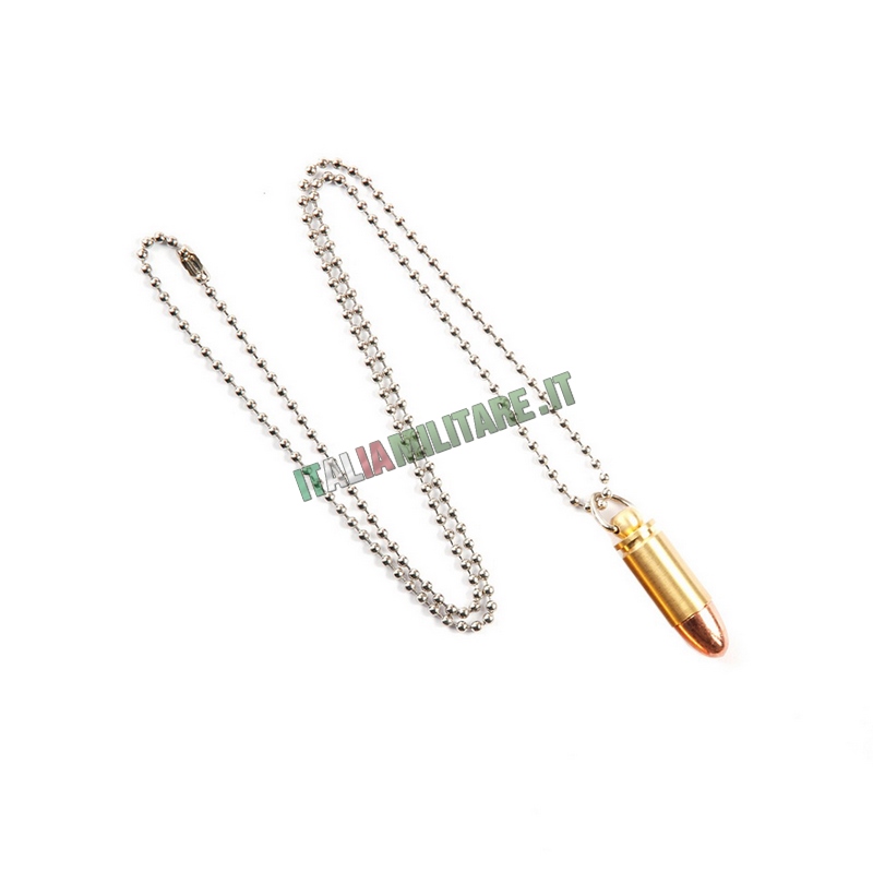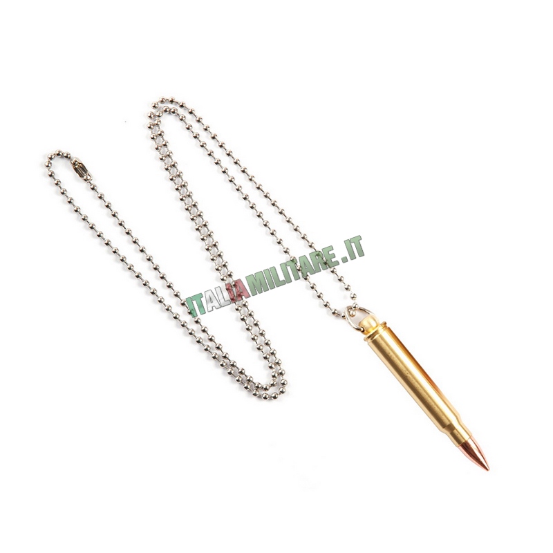 COLLANA "PROIETTILE" CON CATENELLACollana a forma di cartuccia realizzata in metallo, disponibile con vari calibri. La catena in metallo è compresa. MODELLI: