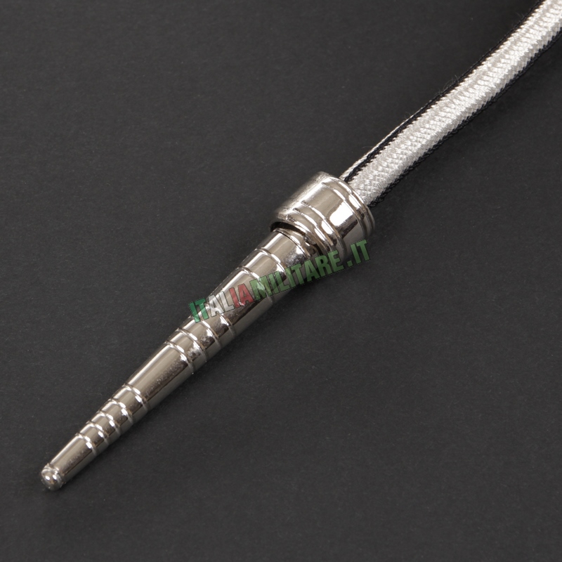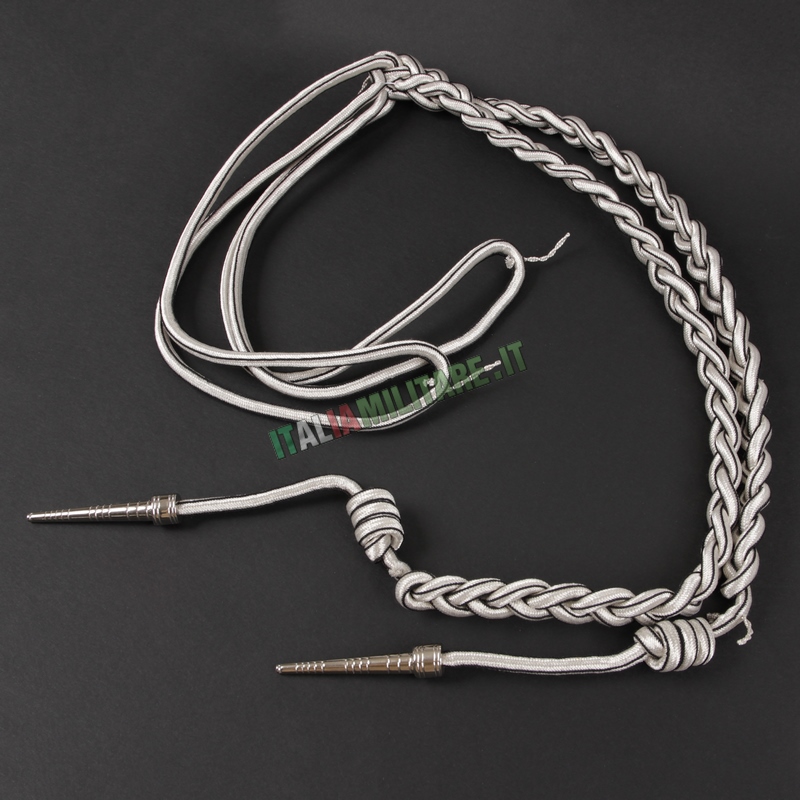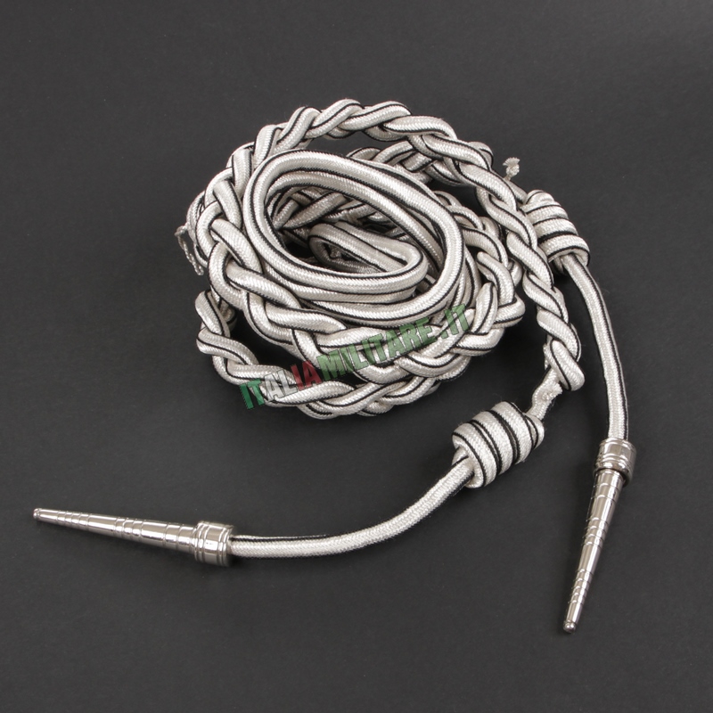 CORDELLINA CARABINIERILa cordellina è un accessorio simbolo del Maresciallo dei Carabinieri che completa la Grande Uniforme Storica GUS e l'Uniforme di Rappresentanza, sia invernale che estiva. Per i Marescialli la cordellina è in colore argento con una sottile bordatura nera, composta da una parte da due trecce culminanti ciascuna con un puntale metallico, dall'altra da due cordoni semplici, sdoppiati. La cordellina si indossa fissandola sotto la controspallina destra, con il tratto più lungo che passa sotto il braccio e quello più corto trattenuto dal cordone interno alla treccia. L'anello, disposto ai capi della treccia, viene agganciato al bottone più alto della bottoniera. IMPORTANTE: questo articolo è un prodotto ufficiale autorizzato da parte dell'Arma dei Carabinieri, viene venduto con cartellino che ne indica il codice di contratto autorizzativo alla produzione. COLORE: ARGENTO E NERO LUNGHEZZA TOTALE: 130 CM MATERIALE: NYLON E SETA MADE IN ITALY ► ATTENZIONE: LA VENDITA DI QUESTO ARTICOLO È RISERVATA AD APPARTENENTI AL CORPO DI RIFERIMENTO IDENTIFICATI TRAMITE TESSERINO DI RICONOSCIMENTO (Art. 28 TULPS). Da oltre 10 anni Italia Militare si occupa della vendita online di abbigliamento militare, forniture militari e Cordellina Maresciallo da Grande Uniforme GUS vantando una grande esperienza e un magazzino di mille metri quadrati con oltre undicimila prodotti militari disponibili a stock. Supportiamo e riforniamo di abbigliamento militare e accessori militari le nostre forze armate, forze dell'ordine e operatori di sicurezza, anche nelle missioni all'estero. I nostri prodotti sono destinati a militari, outdoor, tempo libero, soft-air e ai collezionisti. Puoi ordinare Cordellina Maresciallo da Grande Uniforme GUS attraverso web, E-mail e telefono. Se hai difficoltà a trovare Cordellina Maresciallo da Grande Uniforme GUS utilizza il campo ricerca per filtrare i risultati. Tutti i prodotti del settore provengono dai più importanti e affidabili fornitori del settore militaria e outdoor. La soddisfazione del Cliente è importante per Italia Militare e per questo la consegna di Cordellina Maresciallo da Grande Uniforme GUS avviene nel più breve tempo possibile.