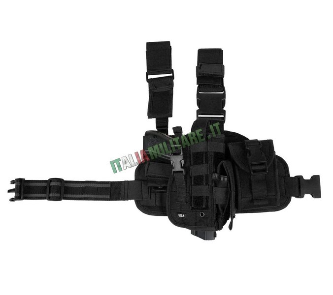 FONDINA CON PIATTAFORMA COSCIALEFondina cosciale militare completa di piattaforma modulare sistema "molle", tasche rimovibili, attacco cosciale e doppio attacco per cinturone - cintura. Ottima la qualità del materiali con cui la fondina militare cosciale di 101 INC è realizzata ed estremamente pratica la possibilità di rimuovere le tasche e la fondina stessa dalla piattaforma mediante attacchi modulari.