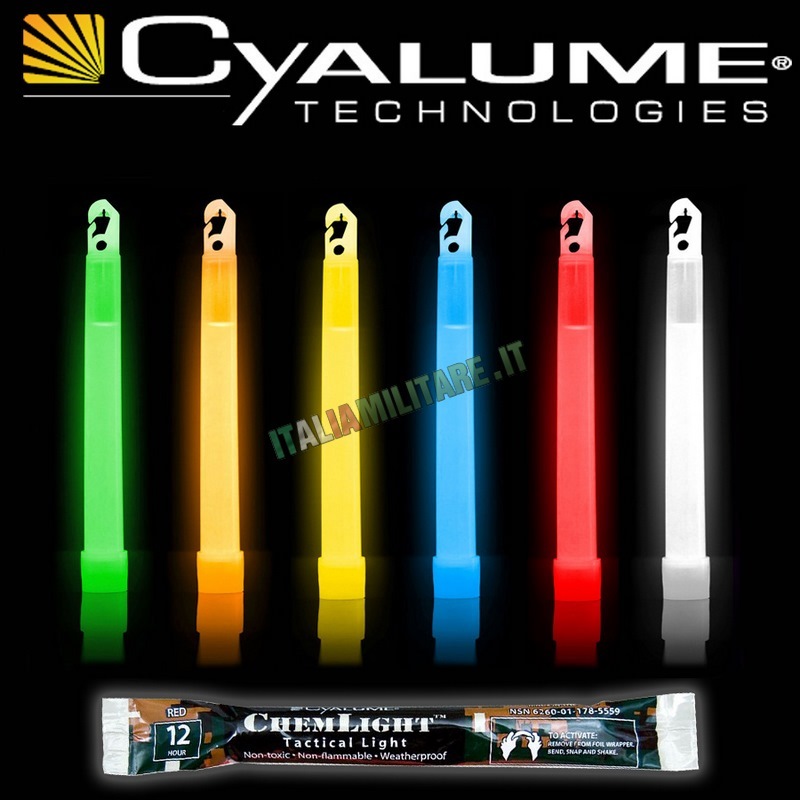 STICK CYALUME ORIGINALE 12 ORECyalume è il nome commerciale di una fonte di luce chimica, autonoma e a breve termine. Fu inventato nel 1969 da Michael Rauhut e Laszlo Bollyky che lavoravano per la American Cyanamid, una ditta manufatturiera statunitense presente anche in Italia. Il Cyalume è costituito da un tubo di plastica traslucido contenente due sostanze separate da un contenitore in vetro che, una volta combinate, emettono luce attraverso la chemiluminescenza, senza bisogno di una fonte di energia esterna. Gli stick di Cyalume sono spesso utilizzati durante operazioni militari per marcare aree e obbiettivi. Gli stick di Cyalume sono impermeabili, non usano batterie, generano calore trascurabile, sono poco costosi e sono usa e getta. Possono tollerare alte pressioni (come quelle che si trovano sott'acqua ad alte profondità), sono utilizzati come fonti di luce e indicatori di luce da parte di ρiυ' forze militari e nel settore del survival outdoor. Il Cyalume, non emettendo calore rilevante o scintille è utilizzabile con sicurezza anche negli ambienti esplosivi (le cosiddette aree "EX") dove una normale illuminazione elettrica potrebbe provocare un serio incidente di sicurezza. Gli stick di Cyalume emettono luce quando le due sostanze chimiche contenute all'interno vengono mescolate attraverso la rottura di un piccolo contenitore al loro interno. Piegando il bastoncino di Cyalume, il contenitore interno si rompe, consentendo alle soluzioni di combinarsi, causando la necessaria reazione chimica. Dopo l'attivazione, lo stick di Cyalume viene tipicamente agitato per mescolare accuratamente e più velocemente i componenti. L'intensità della luce è massima subito dopo l'attivazione, per poi ridursi in modo esponenziale. È possibile "livellare" questo comportamento refrigerando la bacchetta prima dell'attivazione. Dato che si tratta di una reazione chimica, ogni stick di Cyalume può essere utilizzato solo una volta e dopo che la reazione è stata attivata, la luce non può essere spenta.