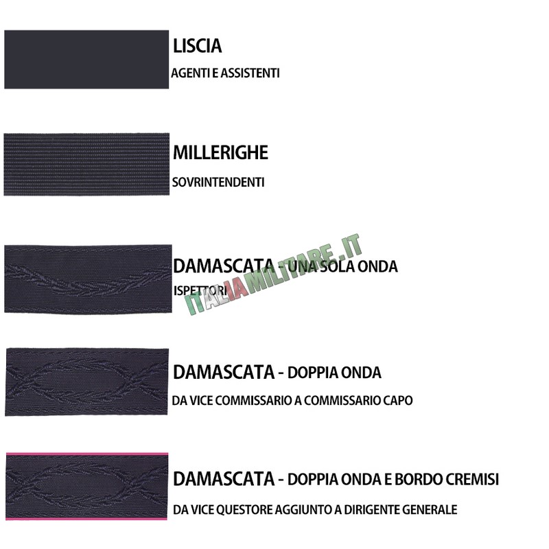 NASTRO MILLERIGHE PER CAPPELLO POLIZIA DI STATOLa fascia, o nastro che dir si voglia, è qui venduto al metro lineare e lo si usa applicandolo sulla circonferenza esterna del cappello da divisa - uniforme di ordinanza della Polizia di Stato. Per meglio chiarire la natura del nastro, è l'accessorio del berretto che guarnisce la parte cilindrica del copricapo (vedi foto per dettagli). IL MODELLO DI NASTRO IN VENDITA È: