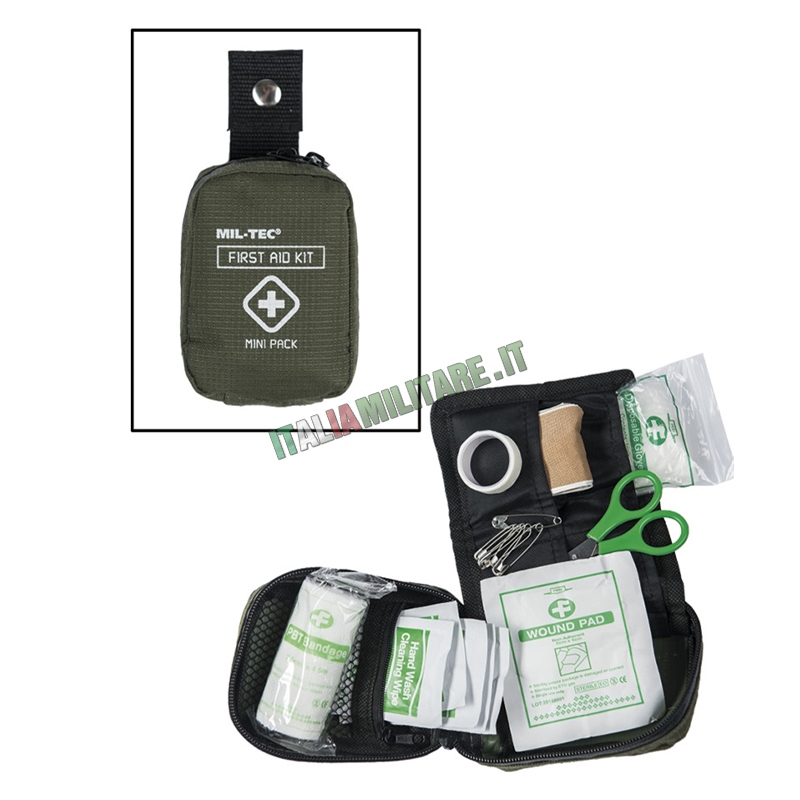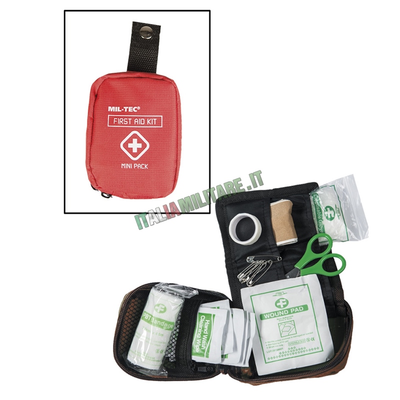 FIRST AID KIT - KIT PRIMO SOCCORSOModello Mini Pack Tasca medica di piccole dimensioni, dotata di vari alloggiamenti all'interno. Sul retro è presente un passante con bottone per consentirne l'attacco alla cintura, allo zaino, a gibernaggi, ecc. CONTIENE (TUTTO COMPRESO NEL PREZZO):