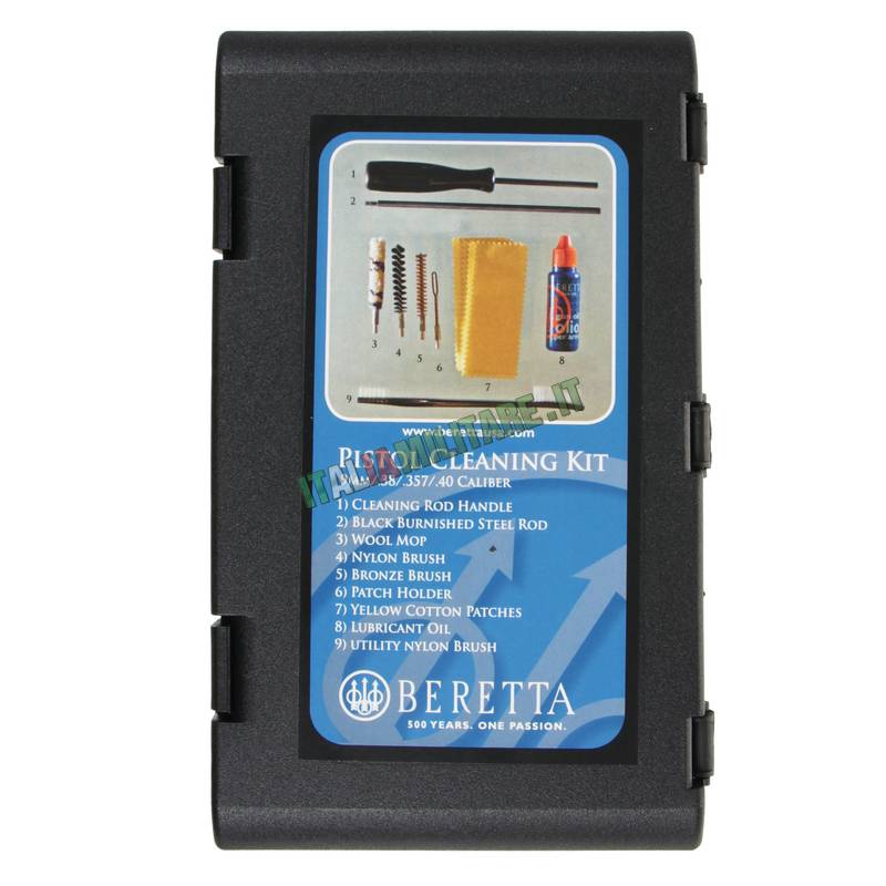 KIT PULIZIA ARMA BERETTAKit di pulizia universale della pistola a marchio Beretta, per calibro 9mm, 38SP, .357MG, semplice ed essenziale per interventi veloci. Il kit è contenuto in un piccolo box rigido antiurto, per proteggere tutte le componenti durante il trasporto e lo stoccaggio. CONTENUTO: