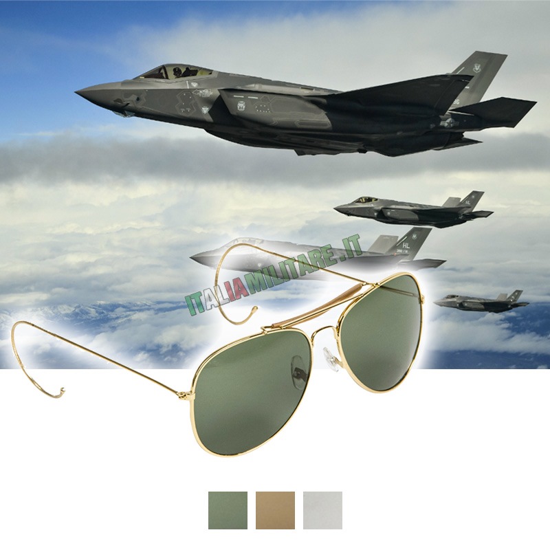 OCCHIALE DA SOLE MILITARE DA AVIATORE U.S. Air ForceÈ un modello di occhile iconico, utilizzato dagli operatori dell'Aeronautica Militare americana e presenti in numerosi film. Hanno aste flessibili e arrotondate così da garantire una tenuta ottimale sulla testa, e lenti a forma di goccia. Completi di custodia e panno. COLORE MONTATURA: ORO