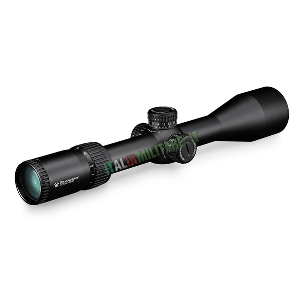 CANNOCCHIALE OTTICA 6-24X50 VORTEX DIAMONDBACK TACTICAL FFP-EBR-2COttica U.S.A. di tipo professionale high level con ingrandimenti da 6X a 24X regolabili manualmente e oculare 50 millimetri per immagini estremamente luminose. Reticolo illuminato per un'ottima inquadraturra anche in condizioni di scarsa illuminazione. Perfetta per arma lunga, per tiro a lunga distanza anche su grossi calibri e caccia. Reticolo FFP First Focal Plane dinamico che si ingrandisce all'aumentare dell'ingrandimento. Corpo realizzato in alluminio massiccio. Dotata di torrette di regolazione aperte di tipo tattico per compensazione della distanza, caduta e deviazione. Regolabile a passi di 1/4 MOA. A prova di annebbiamento, colpi e acqua. Come tutte le ottiche di livello superiore, è riempita ermeticamente di gas argon per scongiurare gli appannamenti: ambienti molto freddi possono far condensare infatti l'umidità presente naturalmente nell'aria; senza l'uso del gas azoto (privo di umidità), l'umidità dell'aria presente all'interno del tubo del cannocchiale si condenserebbe a contatto con le lenti fredde e la visione del tiratore sarebbe appannata, vanificando il tiro. L'azoto impedisce questo fenomeno persino in climi molto freddi.