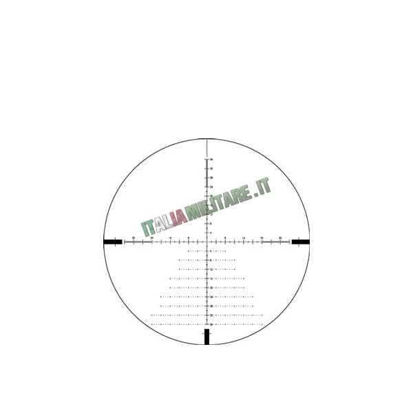 RETICOLOReticolo marcato con linee MRAD e punti di riferimento per correzioni di distanza e vento. DIMENSIONI DELLE VARIE PARTI DELL'OTTICA (in centimetri)E' importante conoscere le misure dell'ottica in modo da stabilire se sono adatte alla propria arma e che tipo di anello serve per il montaggio. Nello schema che segue troverai tutti i riferimenti necessari espressi in centrimetri.