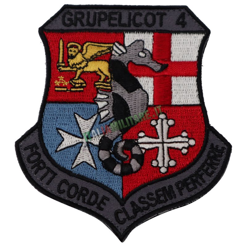 PATCH - TOPPA: 4° GRUPPO ELICOTTERIPatch in scratch ricamato del Quarto Gruppo Elicotteri della Marina Militare (GRUPELICOT 4), con scritta sul fondo "Forti Corde Classem Perferre". MATERIALE: TESSUTO RICAMATO SCRATCH SU RETRO: SI MISURA (punti massimi): LARGHEZZA 8,5 CM X ALTEZZA 10 CM MODELLO: