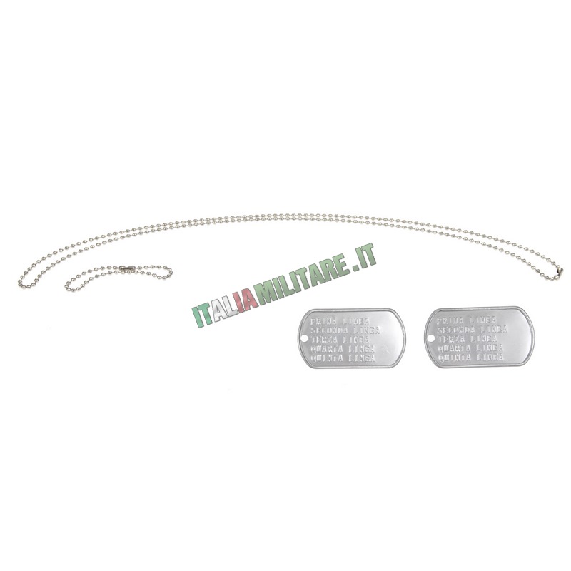 PIASTRINE MILITARI PERSONALIZZATECoppia di piastrine militari con catenella, personalizzate tramite PUNZONATURA. Classiche piastrine militari, personalizzate su tue specifiche. Fornite con catenella lunga per il collo e catenella piccola per supporto alla seconda piastrina, esattamente come in foto.