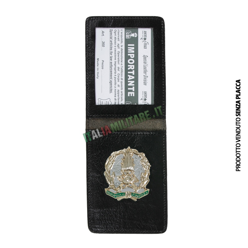 PORTA DISTINTIVO DA TASCHINO GUARDIA DI FINANZA 360Portafogli e porta placca Guardia di Finanza verticale Ascot da taschino con porta tessera, realizzato in Italia in pregiata vera pelle. Idoneo per essere esposto inserito nel taschino della giacca o nella tasca dei pantaloni, per identificarsi durante il servizio in borghese. Distintivo Guardia di Finanza opzionale, dotato di molla armonica sul retro e di numero seriale registrato. Ottima qualità, realizzato in Italia con vera pelle che gli conferisce un'ottima resa estetica ed una grande resistenza all'uso.