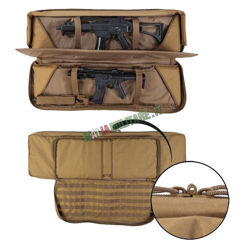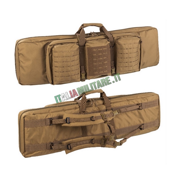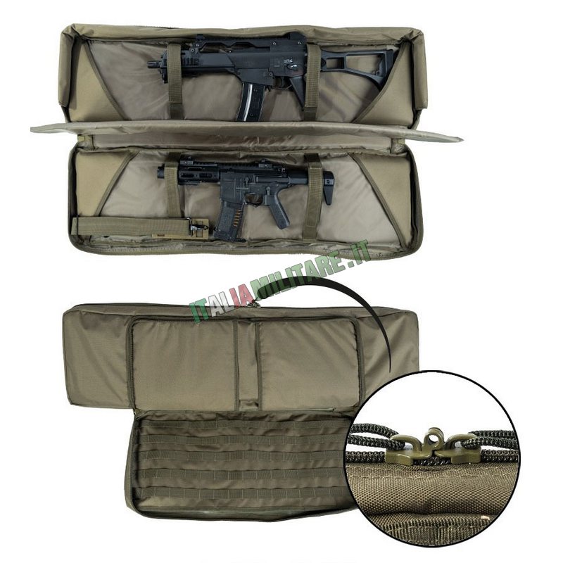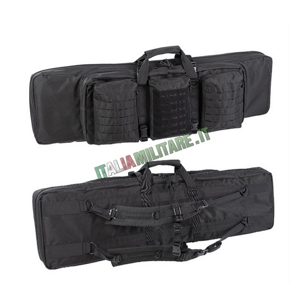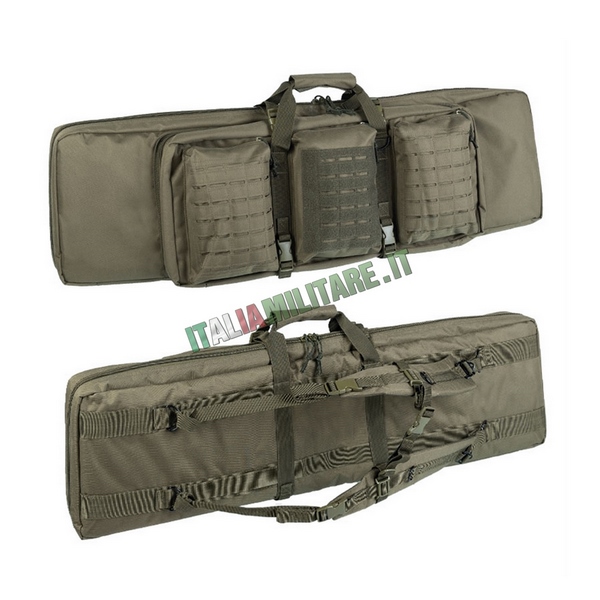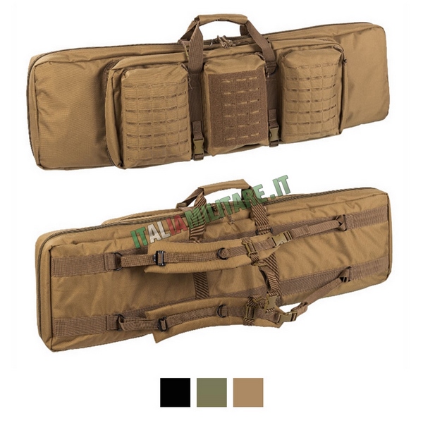 BORSA MILITARE PORTA 2 FUCILINuova generazione del classico modello di porta fucile militrare dell MilTec adatta per trasportare fino a 2 armi lunghe contemporaneamente oltre a pistole in apposito vano e strutturata con spallacci per il trasporto in spalla, tasche e attacchi modulari militari sistema MOLLE in taglio laser; questo nuovo modello di porta fucile può anche essere utilizzato come materassino da tiro.