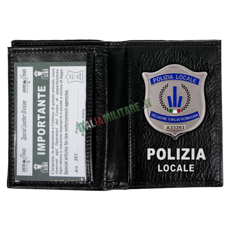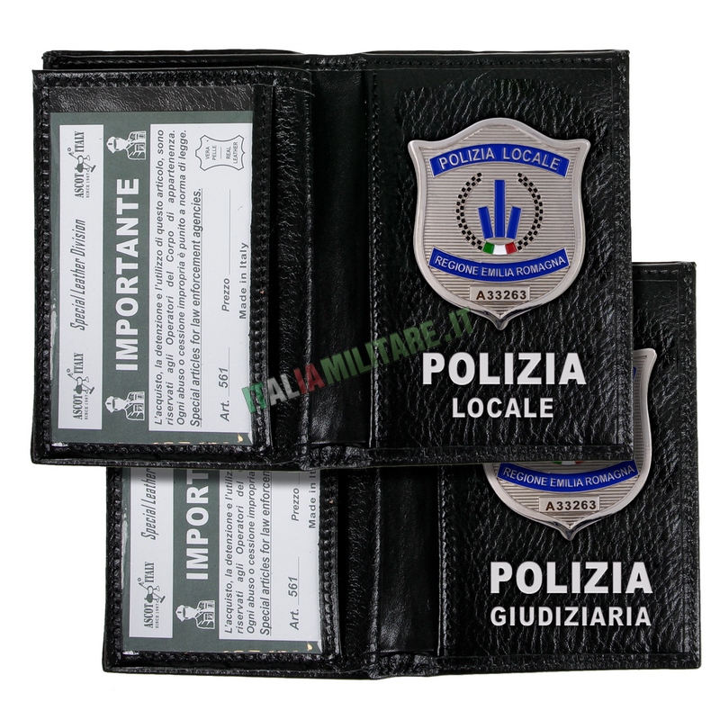 PORTAFOGLIO OCCULTABILE PORTA DISTINTIVO EMILIA ROMAGNA 561Portafogli e porta placca Polizia Locale e Giudiziaria Emilia Romagna verticale Ascot con porta tessera identificativa e porta placca occultabile dietro uno scomparto porta carte di credito, realizzato in Italia in pregiata vera pelle. Può essere aperto e grazie allo scomparto che copre la placca e la tessera di riconoscimento, risulta idoneo per l'uso di tutti i giorni, rendendolo idoneo per identificarsi solo al bisogno. Distintivo Polizia Locale opzionale, dotato di linguetta a molla e di numero seriale registrato. Il portafoglio può essere scelto con scritta "Polizia Locale" o "Polizia Giudiziaria", mentre la placca AS46 ha sempre la scritta "Polizia Locale". Portafogli di ottima qualità, realizzato in Italia con vera pelle che gli conferisce un'ottima resa estetica ed una grande resistenza all'uso.