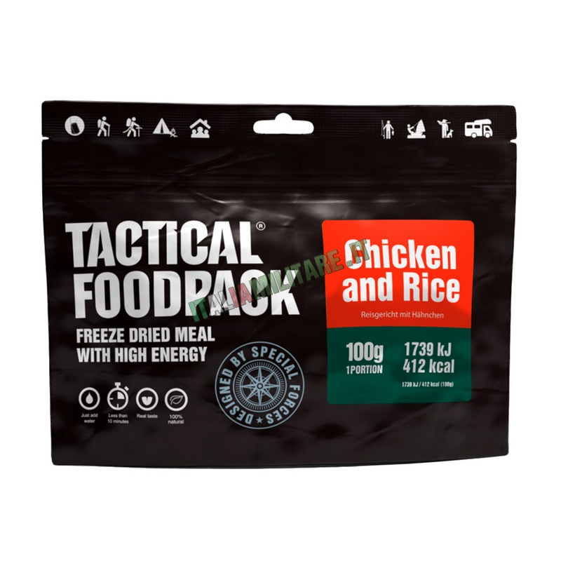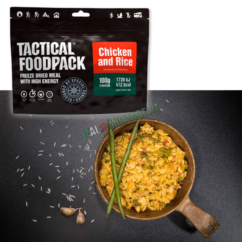 POLLO CON RISORazione - pasto energetico prodotto da Tactical Foodpack ®: sviluppato in ambito militare professionale per rispondere alle esigenze delle forze speciali di molti stati, questa linea è stata prodotto su questa base per impiego in ambito outdoor, in teatro operativo, in situazioni di crisi e per in ρiυ' per qualsiasi avventura all'aria aperta! La caratteristica dei pasti Tactical Foodpack sono l'alta energia combinata con peso ridotto. RAZIONE IN VENDITA: POLLO CON RISO CONTENUTO: 100 gr ENERGIA: 416 kcal MARCA: TACTICAL FOODPACK® Da oltre 10 anni Italia Militare si occupa della vendita online di abbigliamento militare, forniture militari e Razione Tactical Foodpack ® - Pollo con Riso vantando una grande esperienza e un magazzino di mille metri quadrati con oltre undicimila prodotti militari disponibili a stock. Supportiamo e riforniamo di abbigliamento militare e accessori militari le nostre forze armate, forze dell'ordine e operatori di sicurezza, anche nelle missioni all'estero. I nostri prodotti sono destinati a militari, outdoor, tempo libero, soft-air e ai collezionisti. Puoi ordinare Razione Tactical Foodpack ® - Pollo con Riso attraverso web, E-mail e telefono. Se hai difficoltà a trovare Razione Tactical Foodpack ® - Pollo con Riso utilizza il campo ricerca per filtrare i risultati. Tutti i prodotti del settore provengono dai più importanti e affidabili fornitori del settore militaria e outdoor. La soddisfazione del Cliente è importante per Italia Militare e per questo la consegna di Razione Tactical Foodpack ® - Pollo con Riso avviene nel più breve tempo possibile.