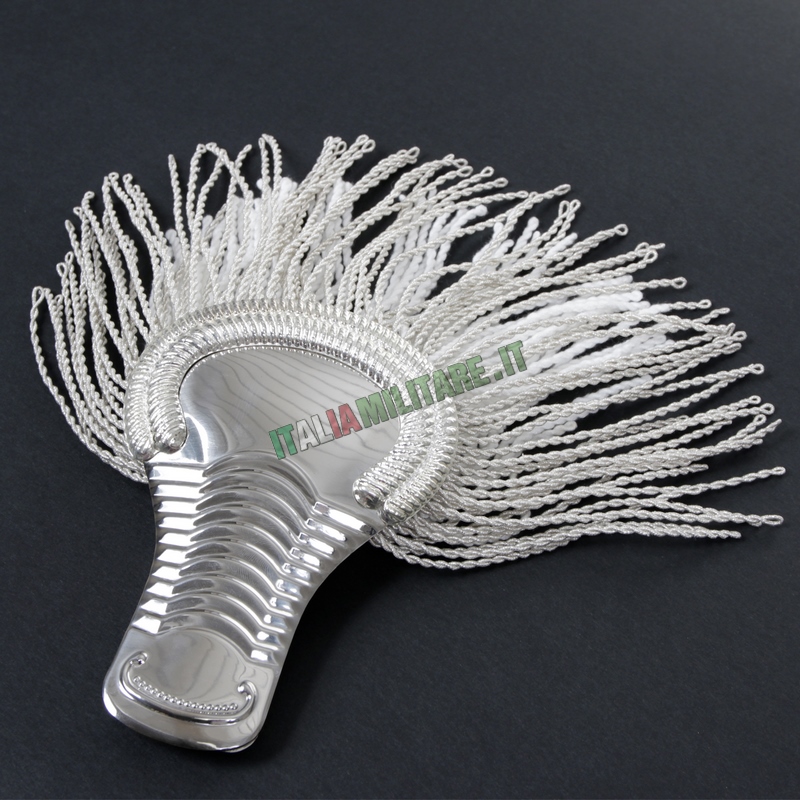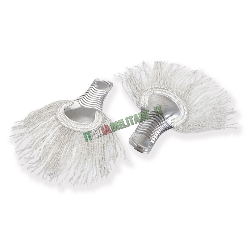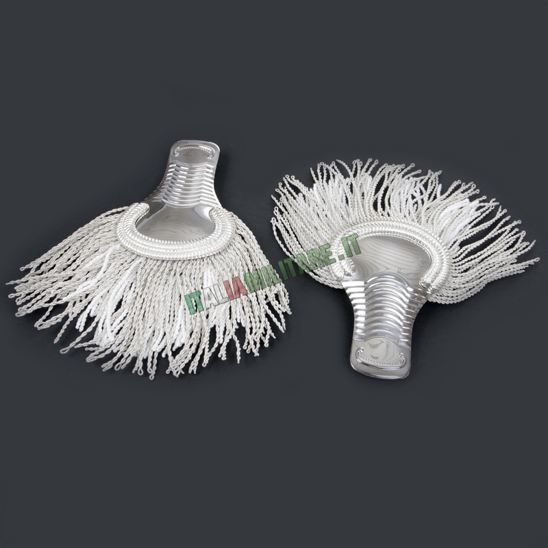 SPALLINE GUS DA MARESCIALLOSpalline per la GUS, Grande Uniforme Storica dei Carabinieri, qui in vendita nel modello da Maresciallo. Il modello da Maresciallo ha, come gli altri, la parte alta piatta e rigida in color argento, bordata in solo argento. Le frange invece sono di due tipi: una fila inferiore in cotone bianco e una superiore esterna in tessuto più robusto e argentato. Al di sotto, le spalline hanno un "gancio" per poter essere inserite sulle spalle della giacca. IMPORTANTE: questo articolo è un prodotto ufficiale autorizzato da parte dell'Arma dei Carabinieri, viene venduto con cartellino che ne indica il codice di contratto autorizzativo alla produzione. MODELLO: MARESCIALLO COLORE: ARGENTO, COME DA FOTO MISURE:
