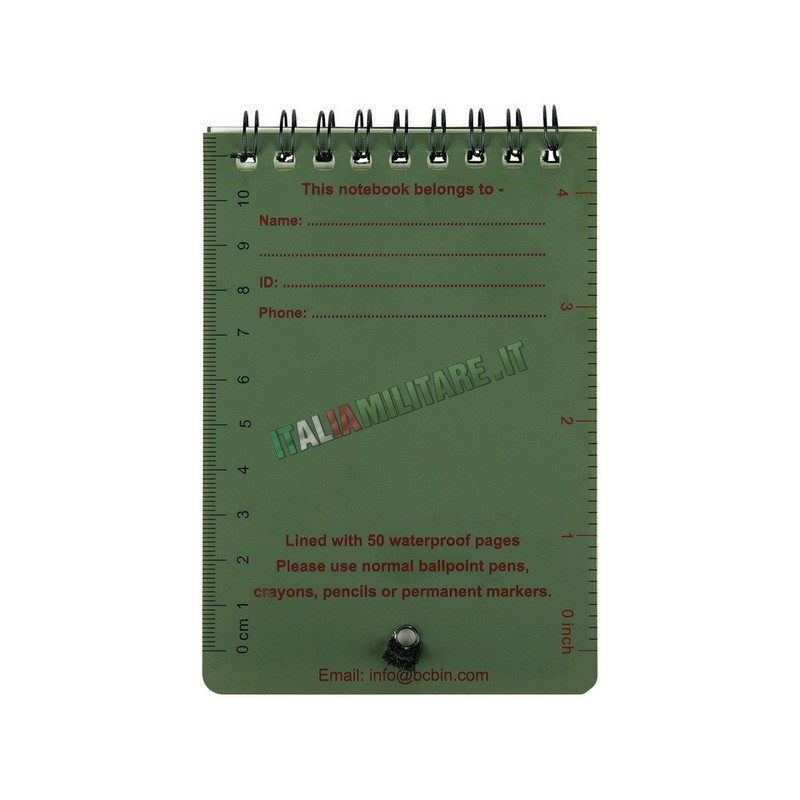 BLOCCO NOTE MILITARE ANTI ACQUACostruito con carta cerata con trattamento idrorepellente, questo blocchetto può essere utilizzato ovunque, perché resiste a qualunque cosa. È ottimo per l'impiego militare, outdoor, ecc perché gli appunti e la scrittura non si sfaldano anche se la carta è bagnata. DIMENSIONI: 12,5 x 8,5 cm CARATTERISTICHE AGENDA: